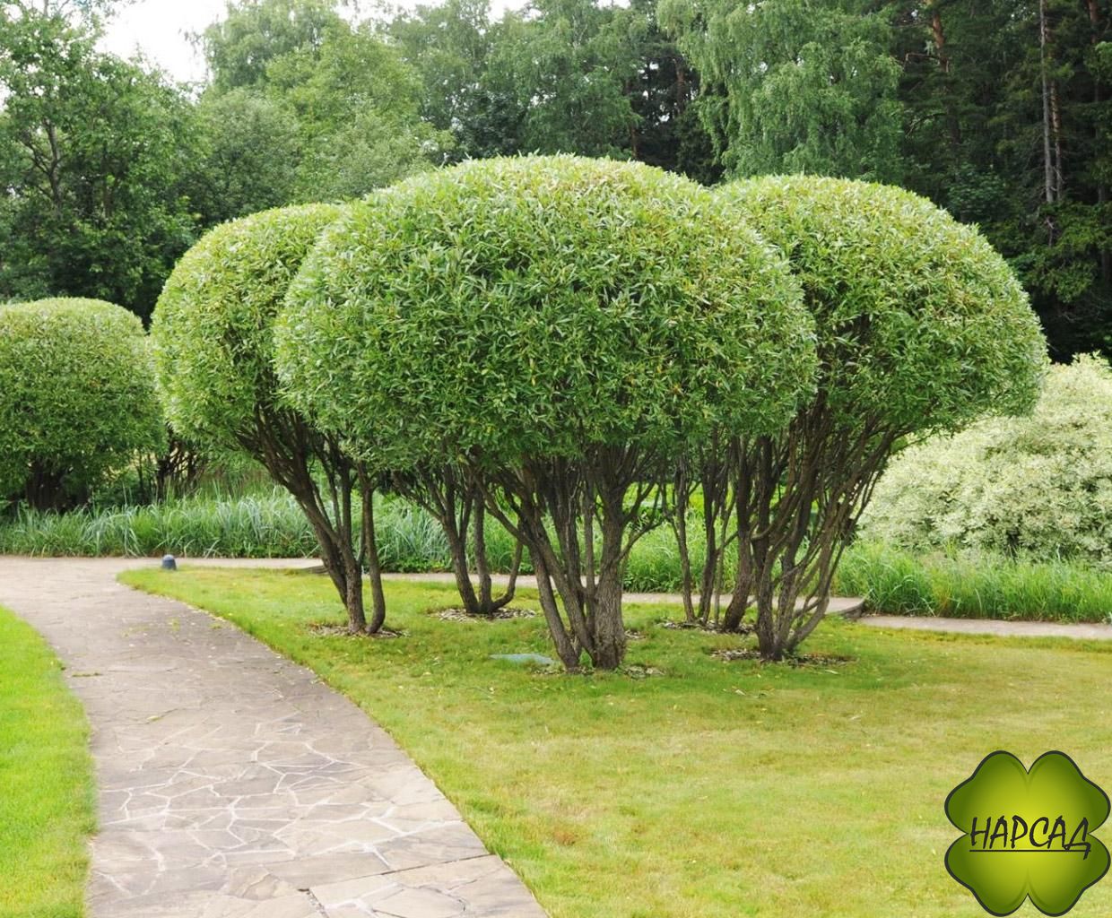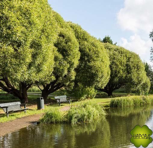 Невысокое дерево с идеально круглой кроной. Листья темно-зеленые узкие длинные.