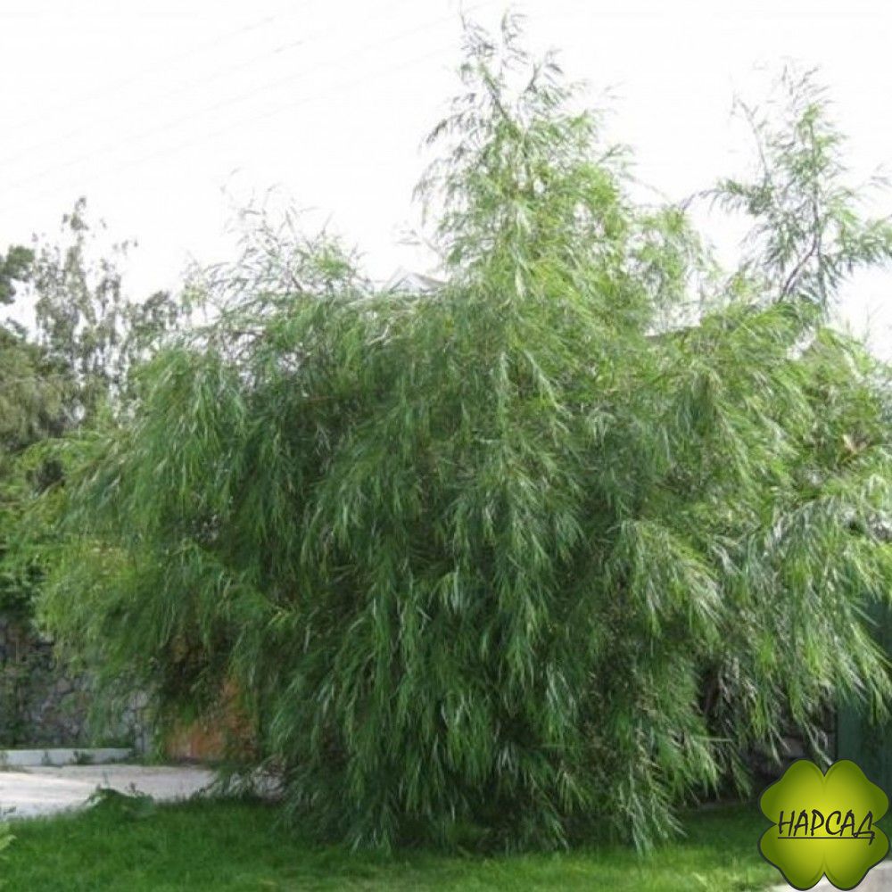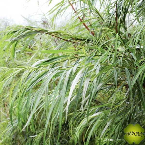 Дерево высотой 10м. Крона в молодом возрасте узкопирамидальная, довольно плотная, с возрастом становится раскидистой. Однолетние побеги меняют окраску от зеленого с красноватыми пятнышками летом через оливковый к пурпурно-бурому зимой. С возрастом у побегов и ветвей преобладает бурый цвет. Листья до 30 см. длиной и 0,7-1 см. шириной, с одной стороны зеленые, с другой — сизовато-серебристые, создают иллюзию повислых побегов. Осенняя окраска ярко-желтого цвета. Сережки женские. В условиях Подмосковья часто не цветет из-за гибели сережек в зимние оттепели.