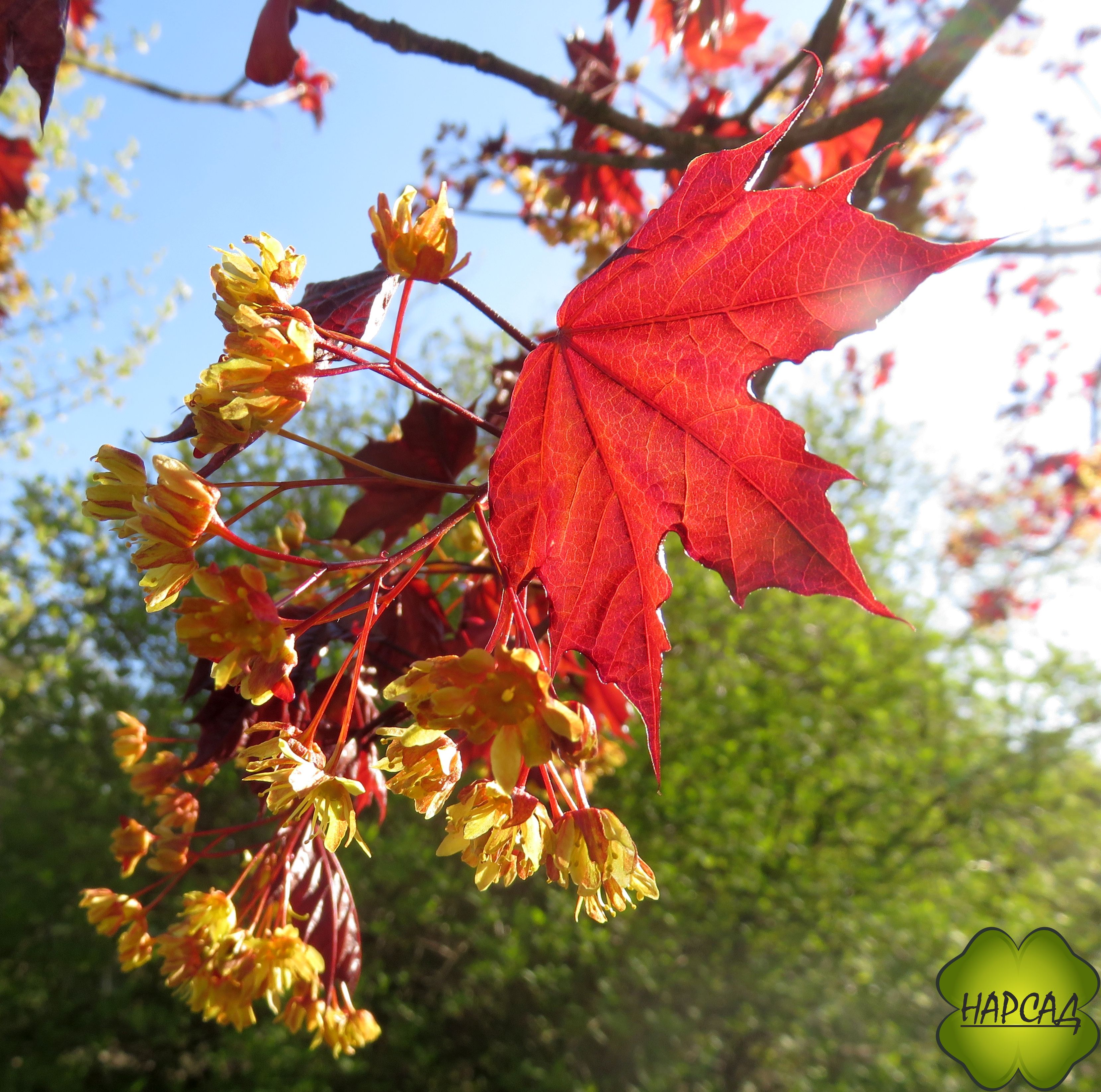 Красивые крупные листья распускаются ярко-красными, затем темнеют до темно-красного, а осенью окрашиваются в красно-оранжевые.