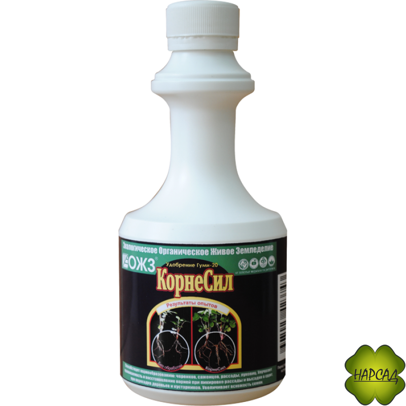 Производитель - компания НВП «БашИнком».Способствует интенсивному развитию корневой системы. КорнеСил ГУМИ-20 - обеспечивает большую площадь питания и улучшает снабжение водой. Таким растениям не страшны засуха и болезни. Восстанавливает корни при пикировке и высадке в грунт рассады, при пересадке деревьев, кустарников. Увеличивает всхожесть семян и энергию прорастания - растения всходят на 3-4 дня раньше.