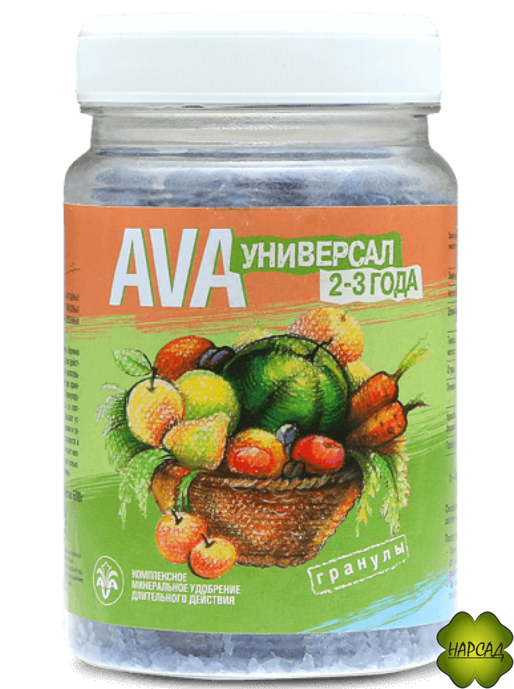 | Марка AVA, в т. ч.: AVA Универсал 2-3 года (250 г., 500 г.,900 г.) AVA Элит Ландшафт 1 кг. AVA Элит Садовод 1 кг. AVA для многолетних садовых цветов 100 г. | Плодово-ягодные и декоративные деревья (яблоня, груша, вишня, слива, и т.д.)– внесение при посадке, подкормке | Весна-осень Внесение в почву, заделать в почву по периметру кроны, в зону активного роста корней | 50-100 г. на дерево |
