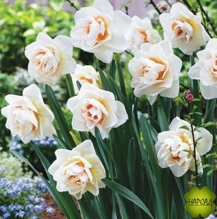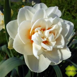 Махровые нарциссы. Селекция - Нидерланды. НОВИНКА 2013 года. Крупный, густомахровый цветок со строго симметричными белыми долями околоцветника; в первые дни с оранжево-розовым наполнением, которое потом переходит в ярко-розовую окраску и покрывает все лепестки коронки. Диаметр цветка 11 см. Цветонос 45-50 см. Средне-поздний срок цветения. Шедевр экстра-класса и многократный победитель выставок нарциссов.
