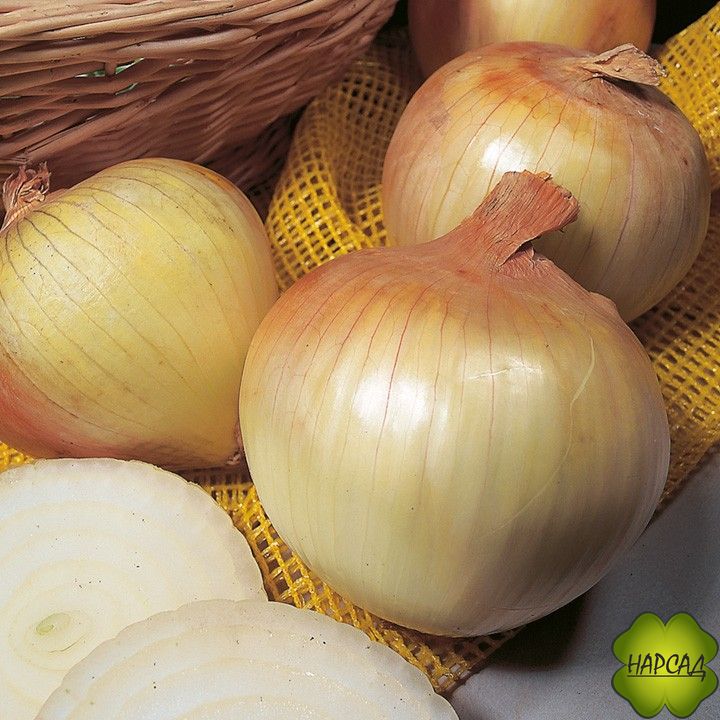 Данный луковый сорт характеризуется выравненностью и привлекательным товарным видом. Вызревают луковицы массой 90-110 граммов, иногда могут вырастать экземпляры до более крупных размеров – до 150 граммов. Форма у овоща округлая, с приплюснутыми боками. Поверхность луковицы гладкая и блестящая. Кожица состоит из 3-4-х сухих чешуек желто-золотистого цвета. Внутренняя часть лука имеет белоснежно-зеленоватую мякоть. Плотность луковиц достаточно высокая. По структуре овощ является малогнездным, поэтому состоит из одной луковички.